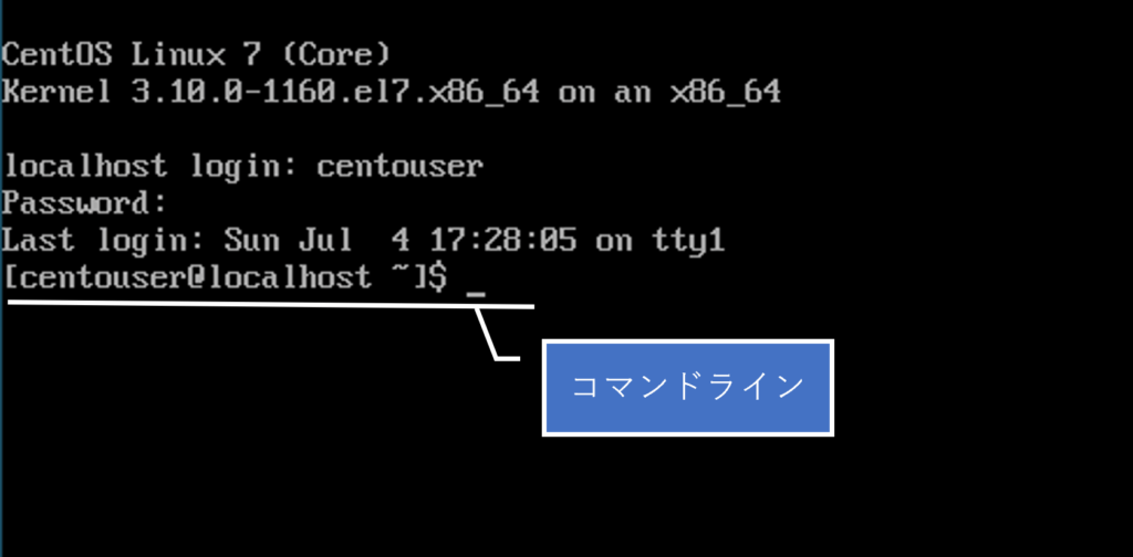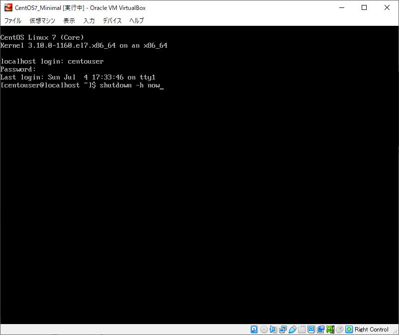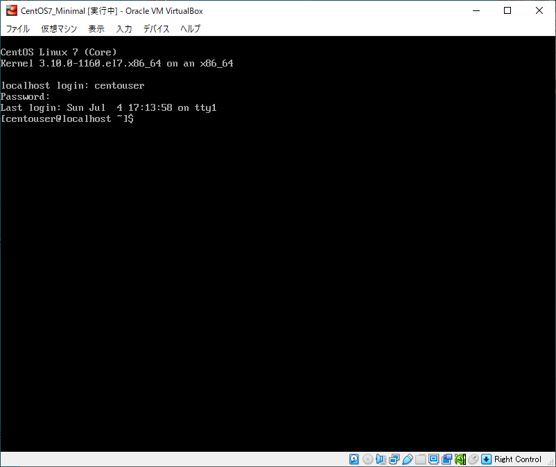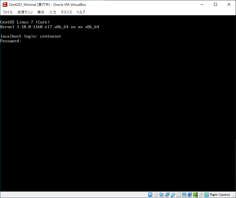 ここでは、CentOS7のインストール時に設定した「centouser」を入力して、Enterキーを押します。